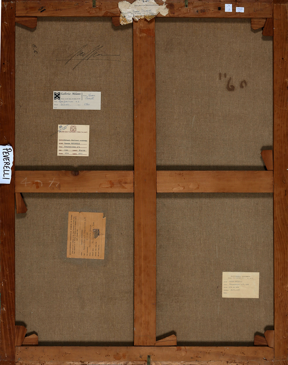 CESARE PEVERELLI 1922 - 2000 Composizione n.3, 1960 Olio su tela, cm. 100 x 81 Firmato sul retro Etichetta Premio Lissone sul retro Etichetta Galleria Milano sul retro Etichetta Galleria Gissi, Torino sul retro Etichetta Quadriennale di Roma 1961 sul retro Etichetta Galleria Odyssia, Roma sul retro Prov. Collezione Privata