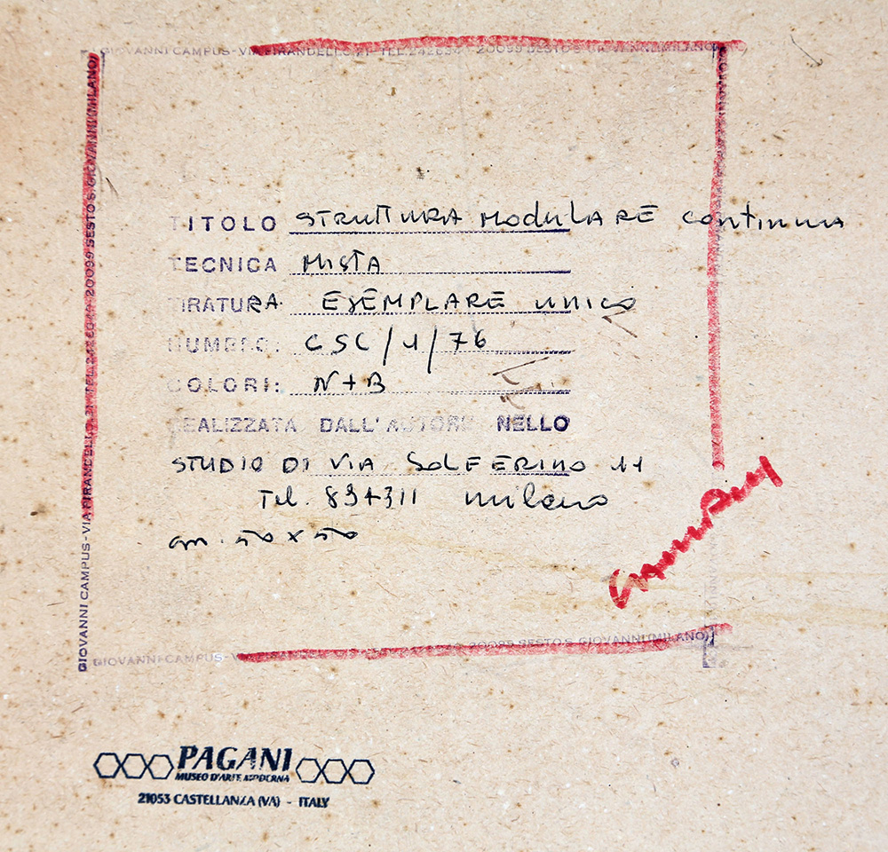 GIOVANNI CAMPUS 1929 Struttura modulare continua, 1976 Tecnica mista su cartone, cm. 50 x 50 Firmato sul retro Timbro Museo Arte Moderna Pagani, Castellanza, (VA) Prov. Collezione Privata
