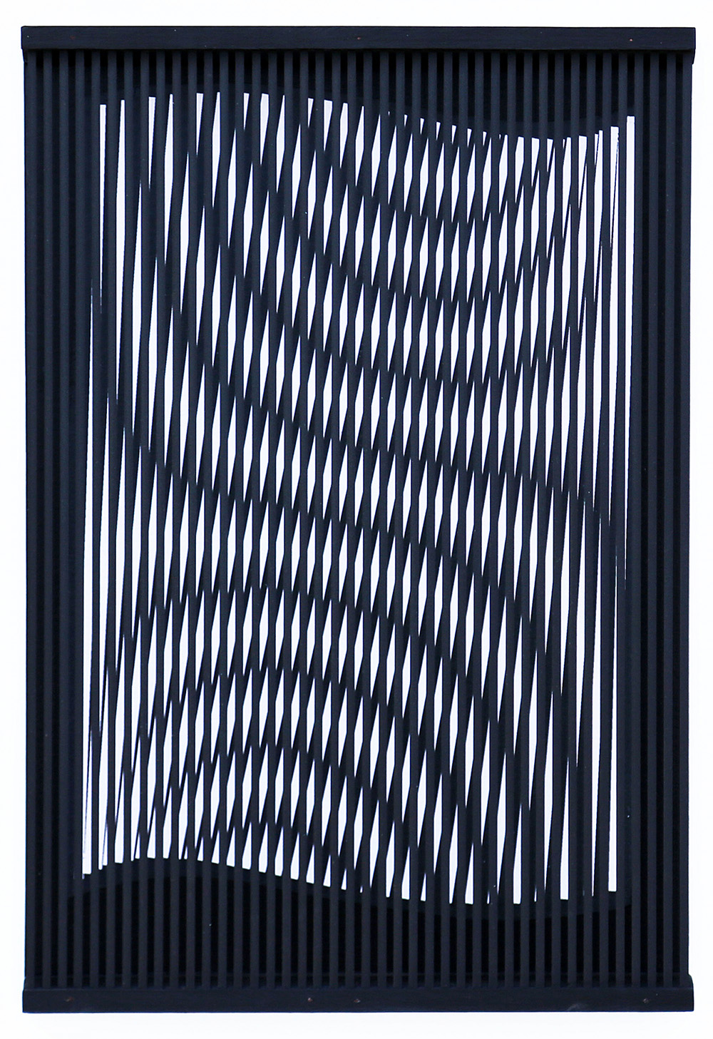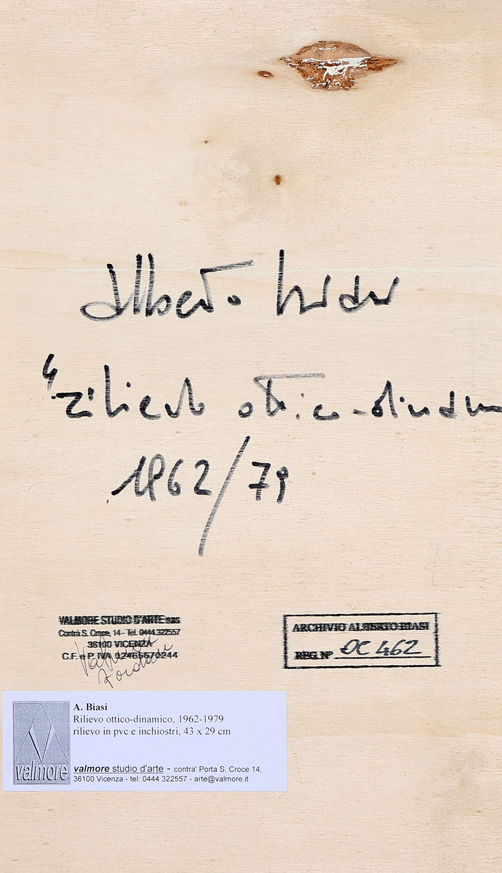 ALBERTO BIASI 1937 Rilievo ottico-dinamico, 1962/79 Tecnica mista e lamelle di pvc su tavola, cm. 43 x 29 Firmato e datato su retro Timbro Studio d’Arte Valmore, Vicenza sul retro Timbro Archivio Alberto Biasi sul retro Autentica Archivio Alberto Biasi su fotografia Prov. Collezione Privata
