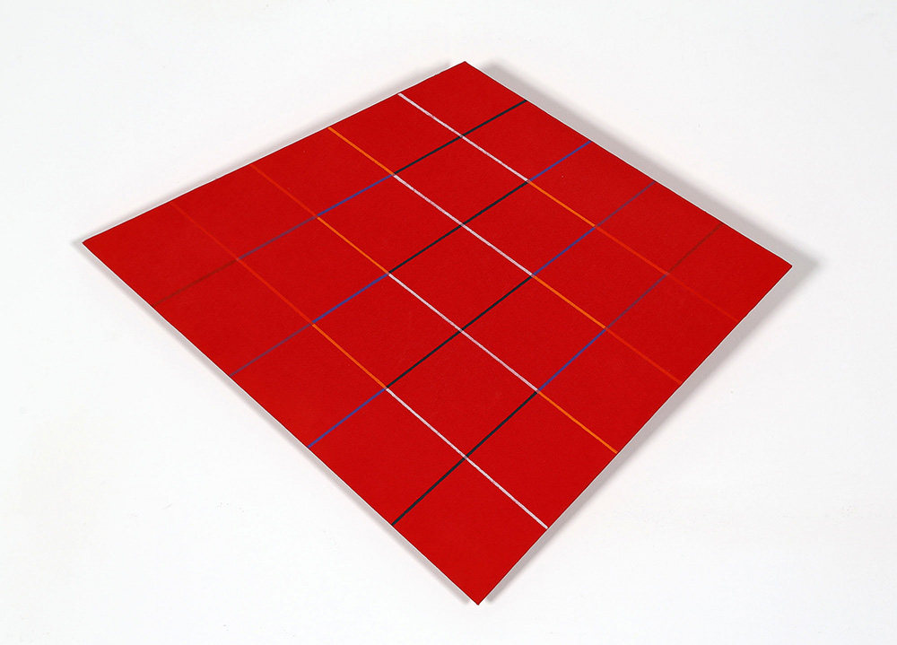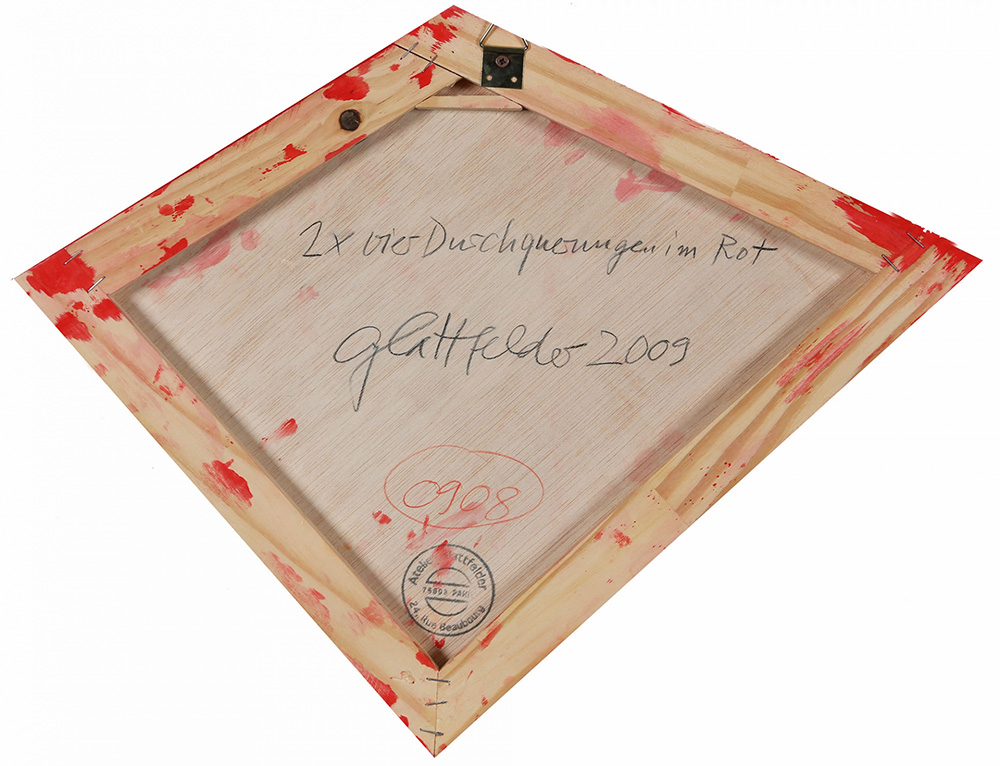 HANS JORG GLATTFELDER 1939 2X4 Durchquerungen, im rot, 2009 Acrilico su tela su tavola, cm. 44 x 55 Firmato e datato sul retro Timbro dell'artista sul retro Prov. Collezione Privata