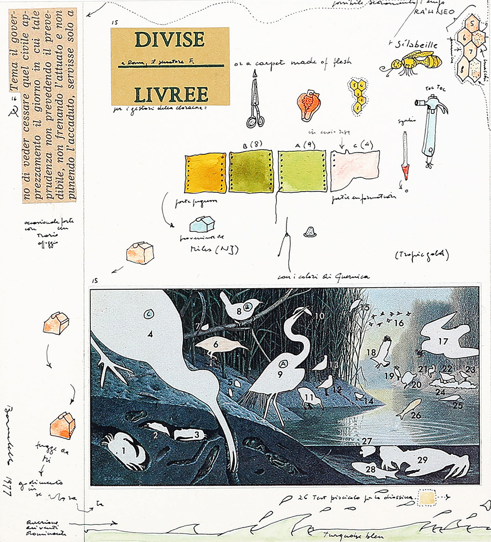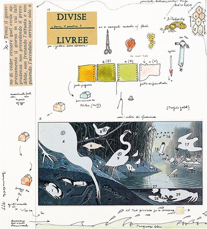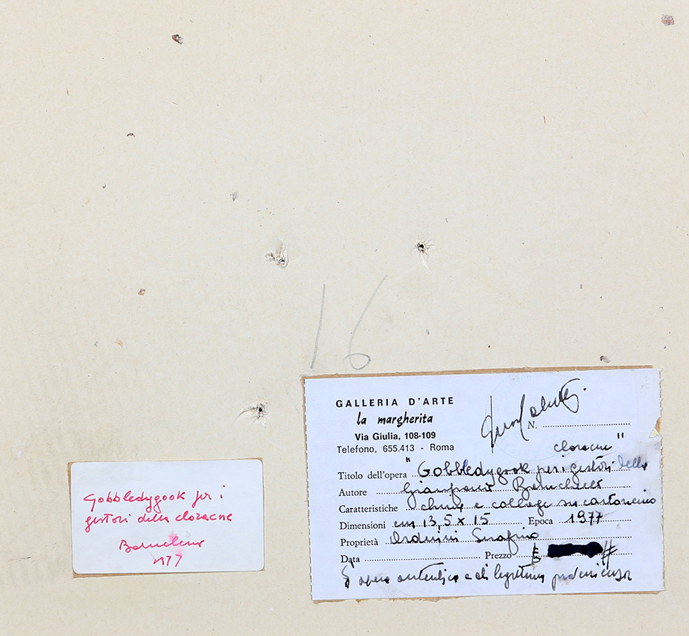 GIANFRANCO BARUCHELLO 1924 Gobbledygook per i gestori della Cloracne, 1977 China e collage su cartoncino, cm. 15 x 13,5 Autentica dell’artista su fotografia Etichetta Galleria d’Arte La Margherita, Roma Prov. Proprietà Privata