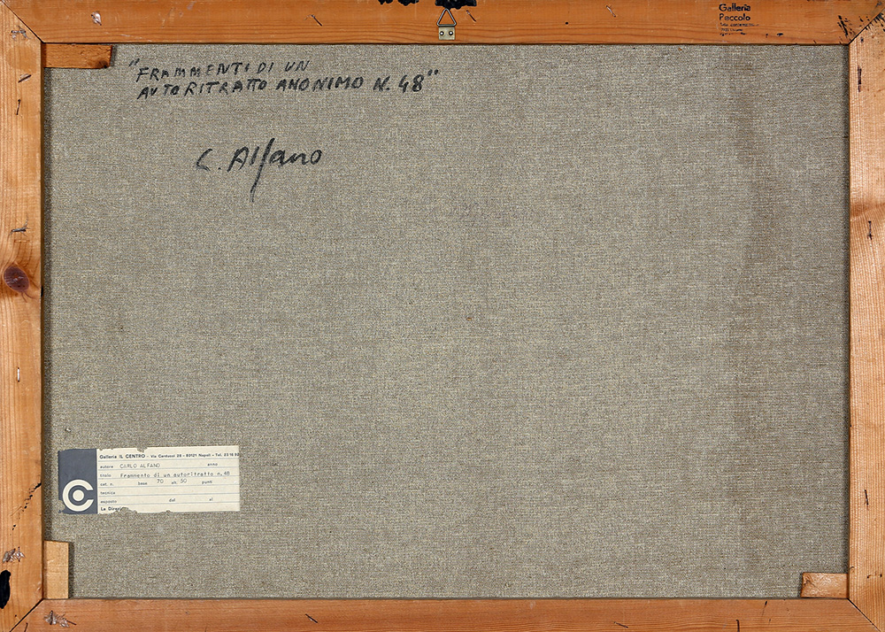 CARLO ALFANO 1932 - 1990 Frammento di un autoritratto anonimo n. 48, 1973 Acrilico su tela, cm. 50 x 70 Firmato sul retro Etichetta Galleria Il Centro, Napoli sul retro Timbro Galleria Peccolo, Livorno sul retro Opera registrata presso l'Archivio Alfano a cura di Flavia Alfano Prov. Collezione Privata
