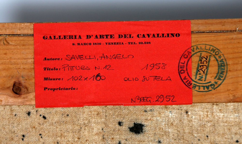 ANGELO SAVELLI 1911 - 1995 Pittura N.12, 1958 Olio su tela, cm. 160 x 102 Firmato sul retro Etichetta e timbro Galleria Cavallino, Venezia sul retro Prov. Collezione Privata