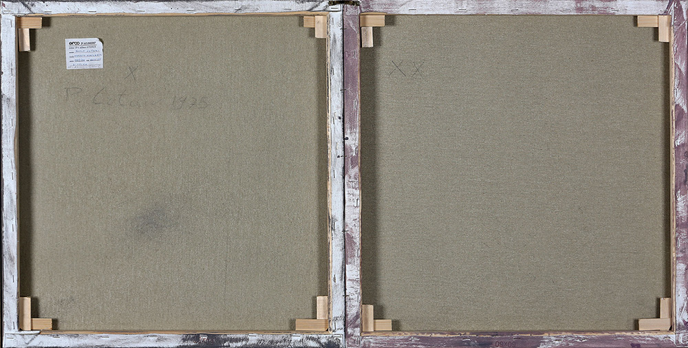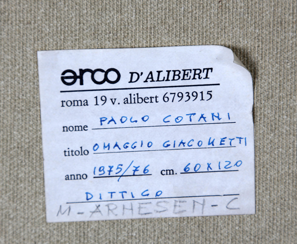 PAOLO COTANI 1940 - 2011 Omaggio a Giacometti, 1975-76 Dittico, tecnica mista su tela, cm. 60 x 120 Firmato e datato sul retro Etichetta Studio d’Arte Arco d’Alibert, Roma, sul retro Prov. Collezione Privata