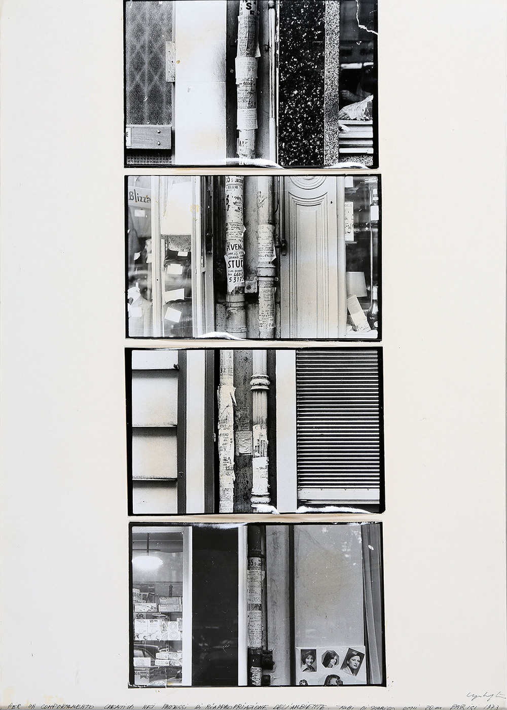 UGO LA PIETRA 1938 Per un comportamento creativo nei processi di riappropriazione dell'ambiente. Tubi di scarico ogni 20 cm. , 1973 4 fotografie, cm. 11,5 x 17 (cad.) Firmato e datato in basso a destra Prov. Collezione Privata