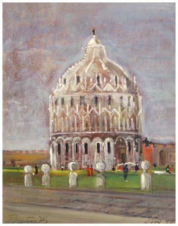 PIERO VACCARI 1926 - 1997 Pisa, Battistero 1990 Olio su tavola 41 x 32,5. Firma in b. a s., località e data in b. a d.; sul verso firma, località, titolo e data.