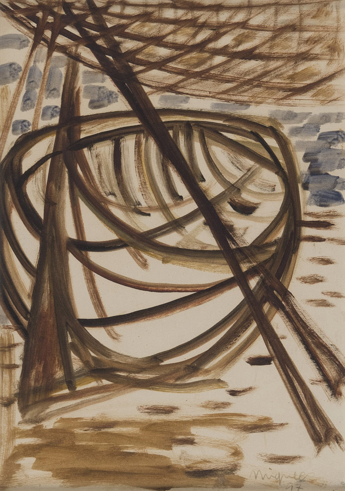 GIUSEPPE MIGNECO (Messina 1903 - 1997) Barca, 1957 Tempera su cartoncino, cm....