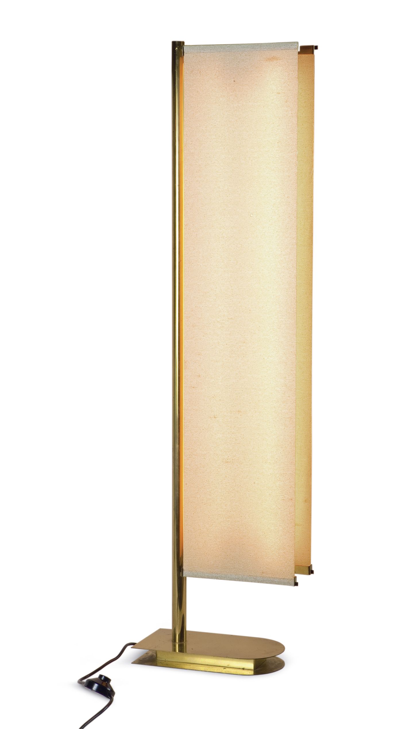 CHIESA PIETRO - Rara lampada da terra. Stoffa e ottone zapponato. Prod. Fontana Arte 1933 (edizione anni ’70). H cm 124,5. Bibl.: Alberto Bassi, "La luce italiana, design delle lampade 1945-2000", Electa 2003, pag. 33.