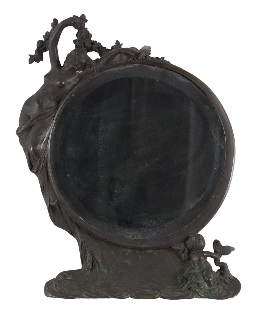 SPECCHIERA STILE LIBERTY in antimonio decorata con ninfa e piccolo tritone....