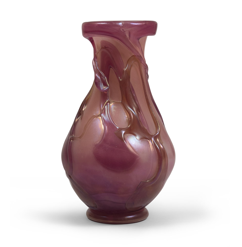 VASO IN VETRO STILE LIBERTY rosa iridescente, h. cm. 28.