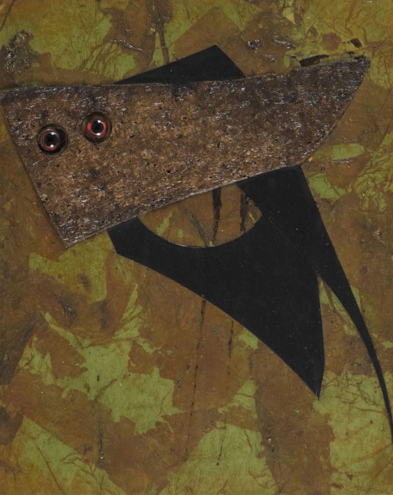 Roberto Crippa (Monza (Mi) 1921 Bresso (Mi) 1972) Oiseau, 1970, Collage polimaterico e sughero su tavola, cm. 41x33 Sul verso: firma, data, titolo e dedica a persona.