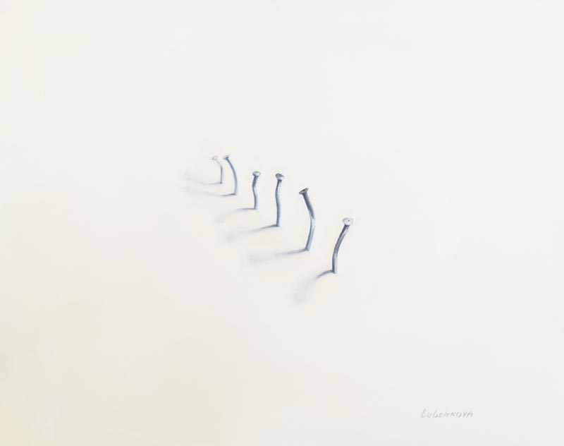 Tatiana Lubenkova (Kazakistan - Pietropavlousk 1974) Le ombre - serie chiodi, 2015, Olio su tela, cm. 40x50 Firmato in basso a destra; Sul verso: firma, data e titolo. Autentica dell'Artista su foto.