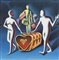 Mark Kostabi (Los Angeles 1960) Emotional baggage, 2008, Olio su tela, cm. 30x30 Firma in alto a sinistra, data in alto a destra; Sul verso: firma, data, titolo e descrizione. Autentica dell'Artista su foto.