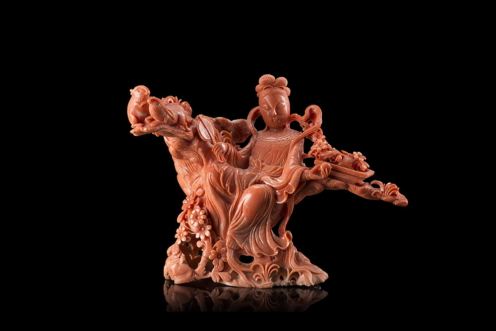 Ramo in corallo intagliato con dama dalle lunghe vesti, animali e rami in...