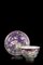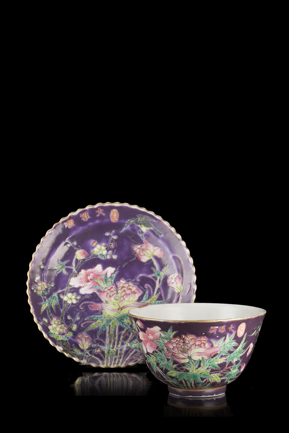 Tazzina con piattino "dayazhai" in porcellana Famiglia Rosa su fondo color melanzana, decorata con uccelli tra rami in fiore, con marchio yongqing changchun in rosso ferro alla base Cina, periodo Guangxu (1875-1908) An aubergine-ground Famille Rose 'dayazhai' cup and stand, decorated with birds perched on flowering branches, with a yongqing changchun mark in iron red to the base China, Guangxu period (1875-1908) (diam. max. 14 cm.)