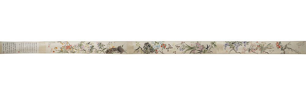 Quattro dipinti raffiguranti le quattro stagioni, con iscrizione calligrafica, inchiostro e colore su carta, montati come scroll orizzontale Cina, sec. XIX Four paintings depicting the Four Seasons, with inscription, ink and colours on paper, mounted as a horizontal scroll China, 19th century (130x19,5 cm. each)