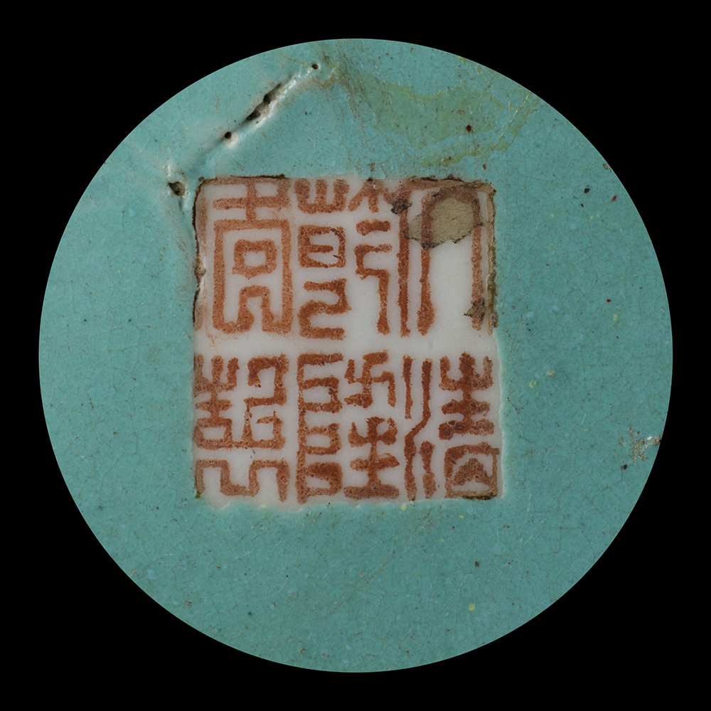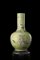 Vaso a bottiglia in porcellana in smalti Famiglia Rosa su fondo verde chiaro con incisioni, decorato con guerrieri in battaglia, marchio apocrifo Qianlong alla base, con base in legno (lievi difetti) Cina, inizio sec. XX A light green ground sgraffiato Famille Rose porcelain bottle vase decorated with battle scene, apocryphal Qinalong mark to the base, with wood base (minor losses) China, early 20th century (h. 33 cm.)