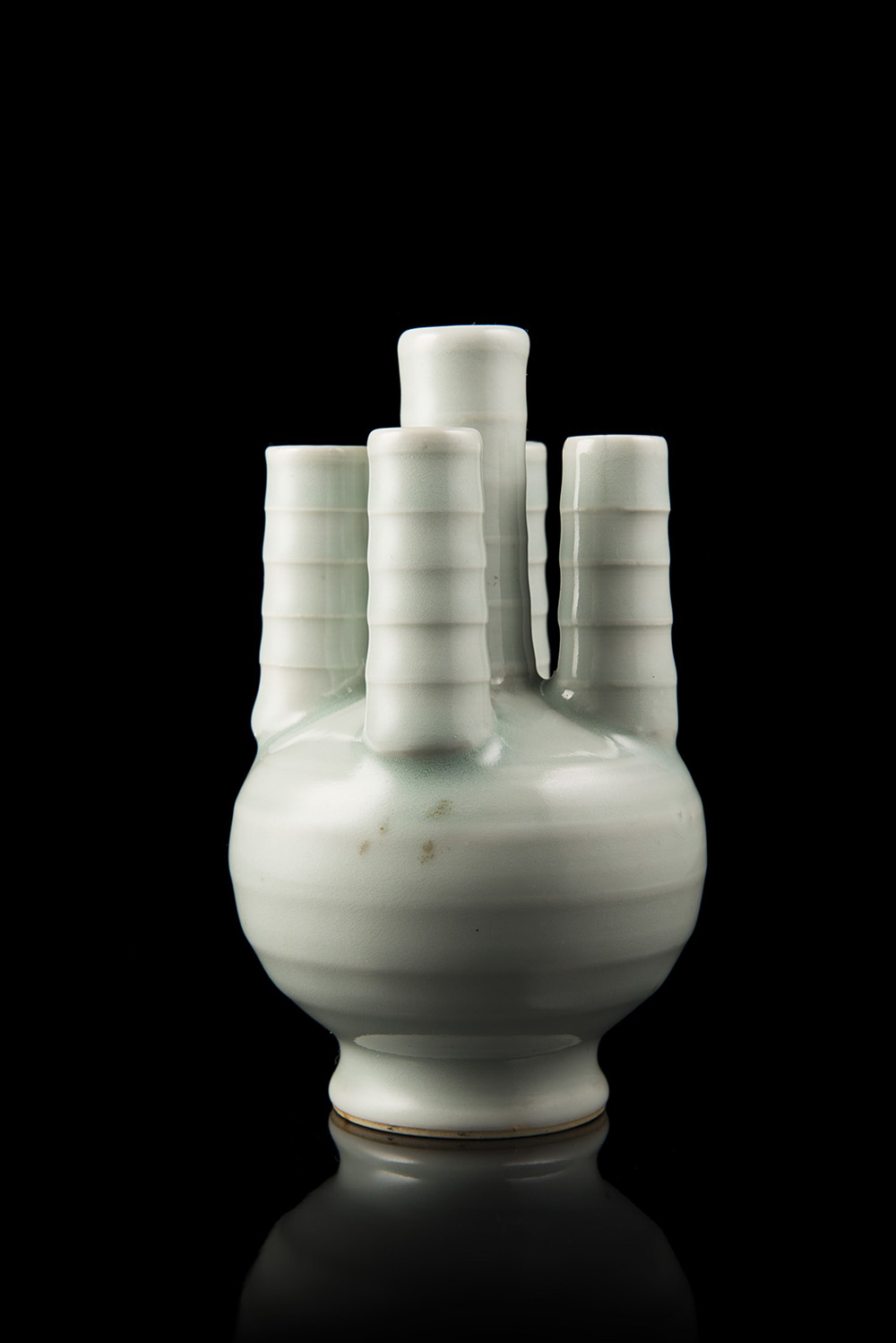 Piccolo vaso con cinque bocche in porcellana dall'invetriatura color celadon,...