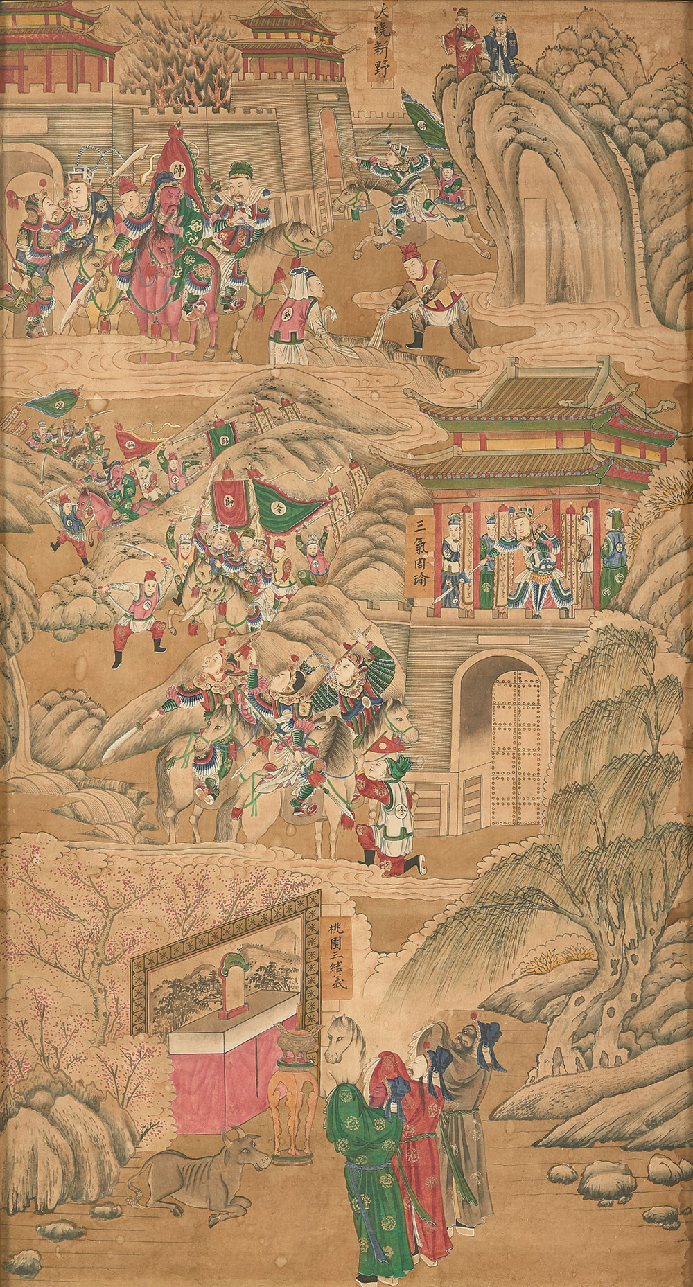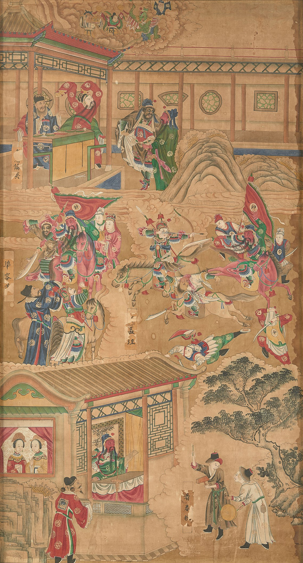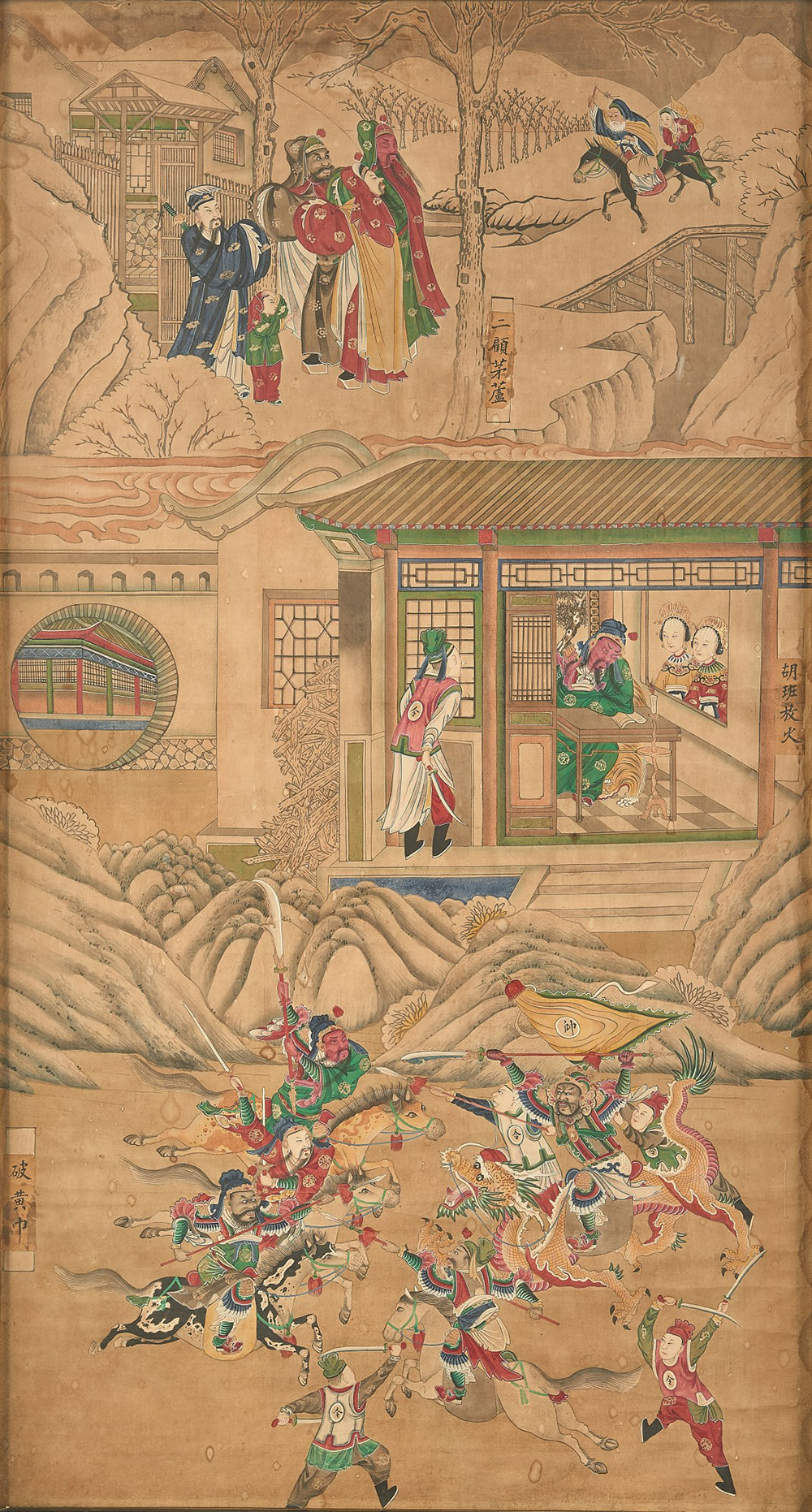 Tre pannelli dipinti raffiguranti battaglie ed episodi epici risalenti al periodo dei Tre Regni, inchiostro e colore su seta, in cornici (difetti) Cina, sec. XIX Three panels depicting battles and classical stories from the Three Kingdoms period, ink and colours on silk, framed and glazed (flaws) China, 19th century (150x90 cm.)