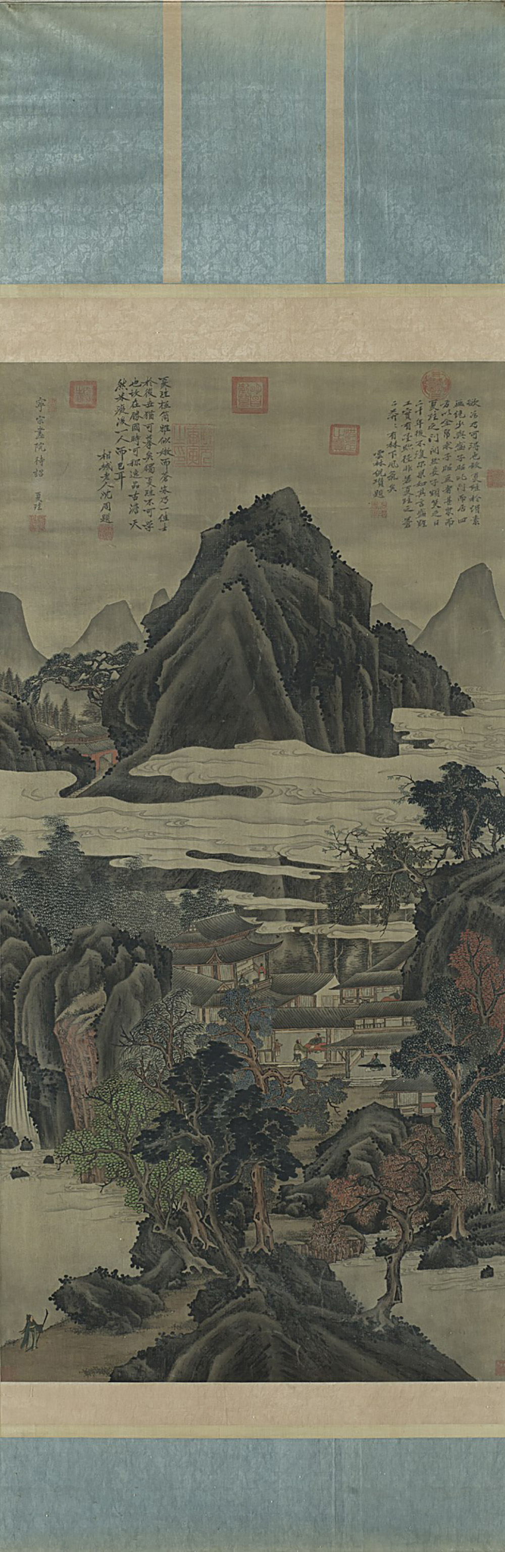 Dipinto raffigurante paesaggio montano nello stile di Xia Gui, inchiostro e colore su seta, con cornice Cina, dinastia Qing (1644-1911) A mountain landscape in the style of Xia Gui, ink and colours on silk, framed and glazed China, Qing dynasty (1644-1911) (152x76 cm.)