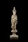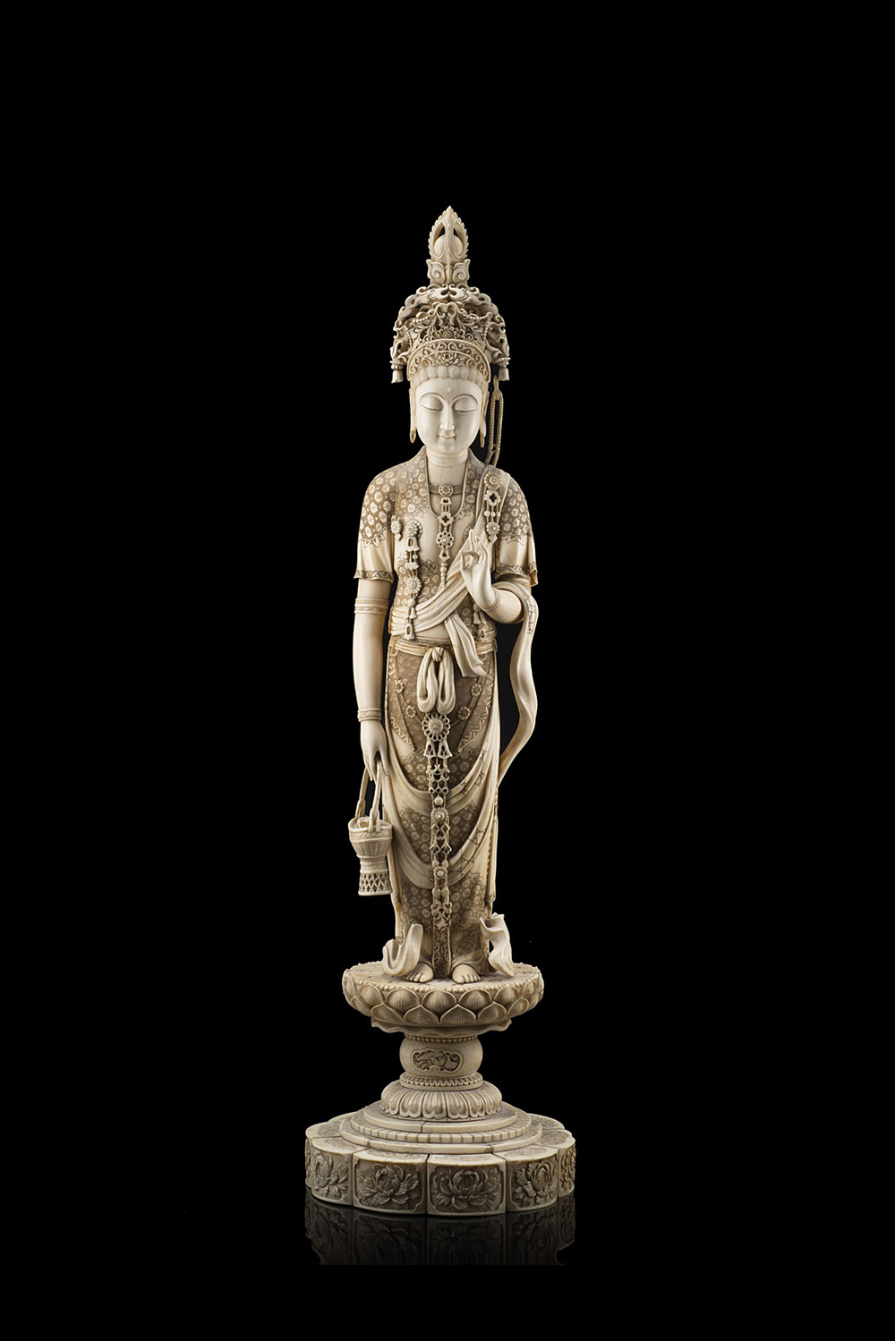 Grande figura in avorio raffigurante divinit‡ femminile su base a forma di loto, indossa morbide vesti e gioielli, il volto sereno, sormontata da elaborata corona, firma in cartiglio rosso alla base (difetti e mancanze) Giappone,sec. XX An ivory figure of a deity standing on a lotus base, wearing long robes and jewelry, with a serene expression and an adorned crown, signed to the base (losses and flaws) Japan, 20th century (h. 76 cm.)