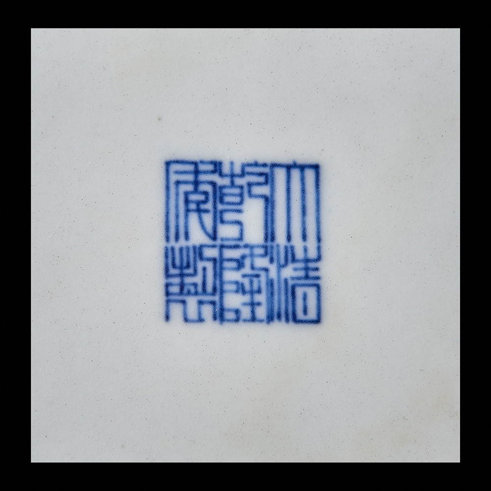 Vaso in porcellana dalla forma quadrangolare, ogni lato decorato con coppie...