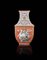 Vaso in porcellana dalla forma quadrangolare, ogni lato decorato con coppie di uccelli in Famiglia Rosa, alternando coppie di fenici e draghi in rilievo in smalti rosso ferro, su fondo dorato, il collo decorato con motivi floreali su fondo bianco, marchio apocrifo Qianlong alla base Cina, sec. XX A famille rose and gilt square-sectioned vase, each side decorated with pairs of birds surmounted by alternating pair of raised dragons and phoenix, enamelled in iron red, all against a gilted ground, the neck with floral motifs on a white ground, the base with apocryphal Qianlong mark China, 20th century (h.47 cm.)