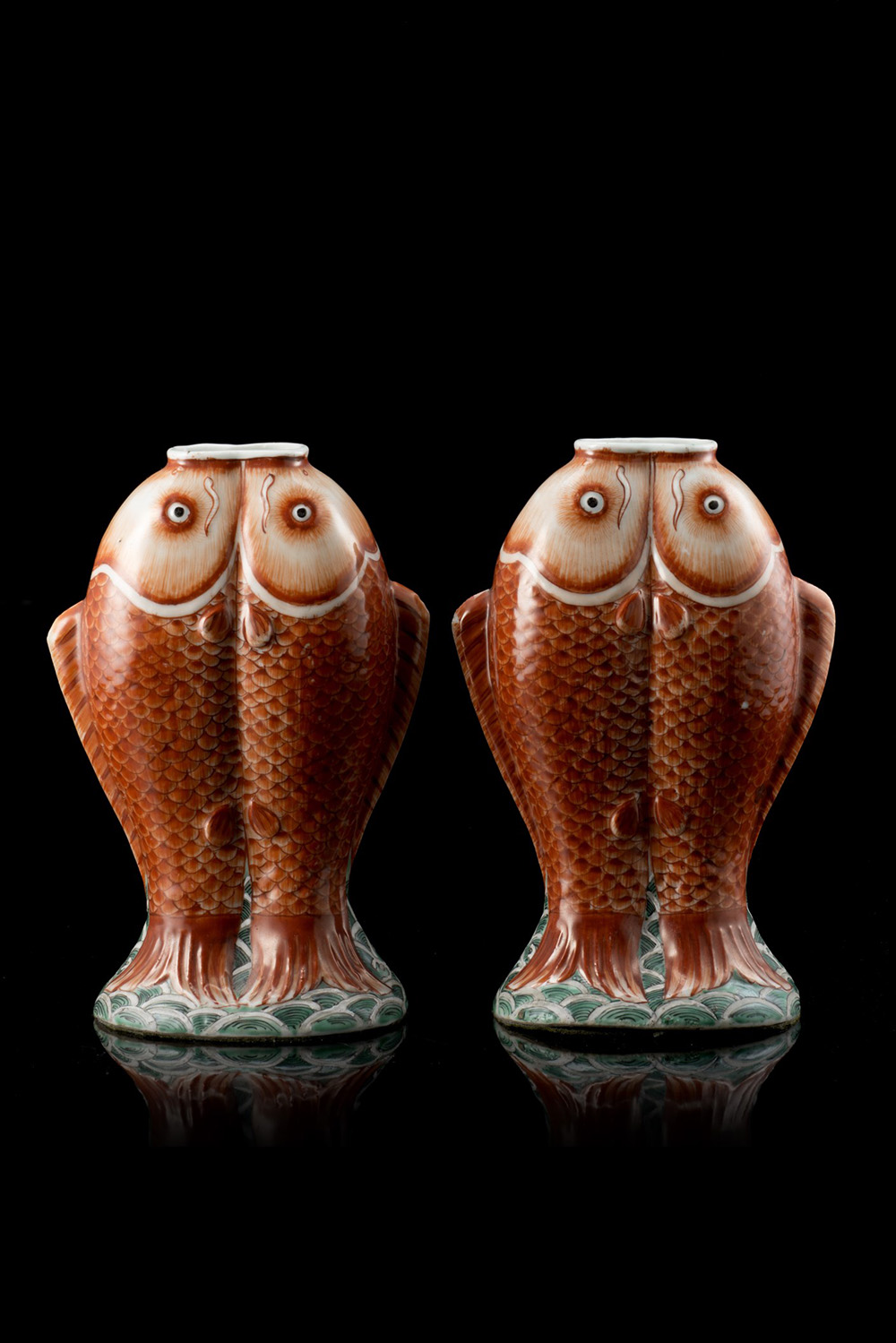 Coppia di vasi a "doppia carpa" in porcellana policroma Cina, dinastia Qing, periodo Qianlong (1736-1795) A pair of 'double carps' porcelain vases, decorated with polychrome enamels China, Qianlong period (1736-1795) (h. 20 cm.)