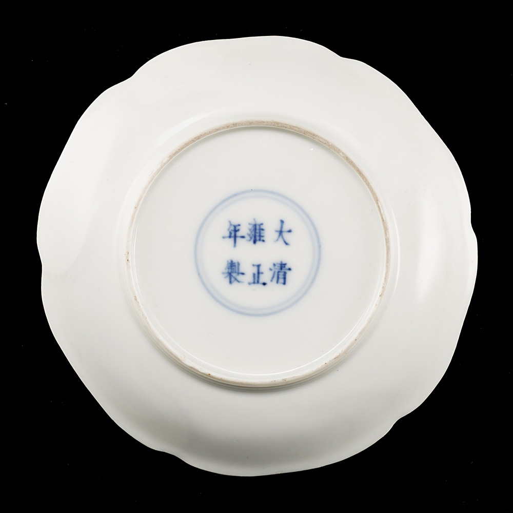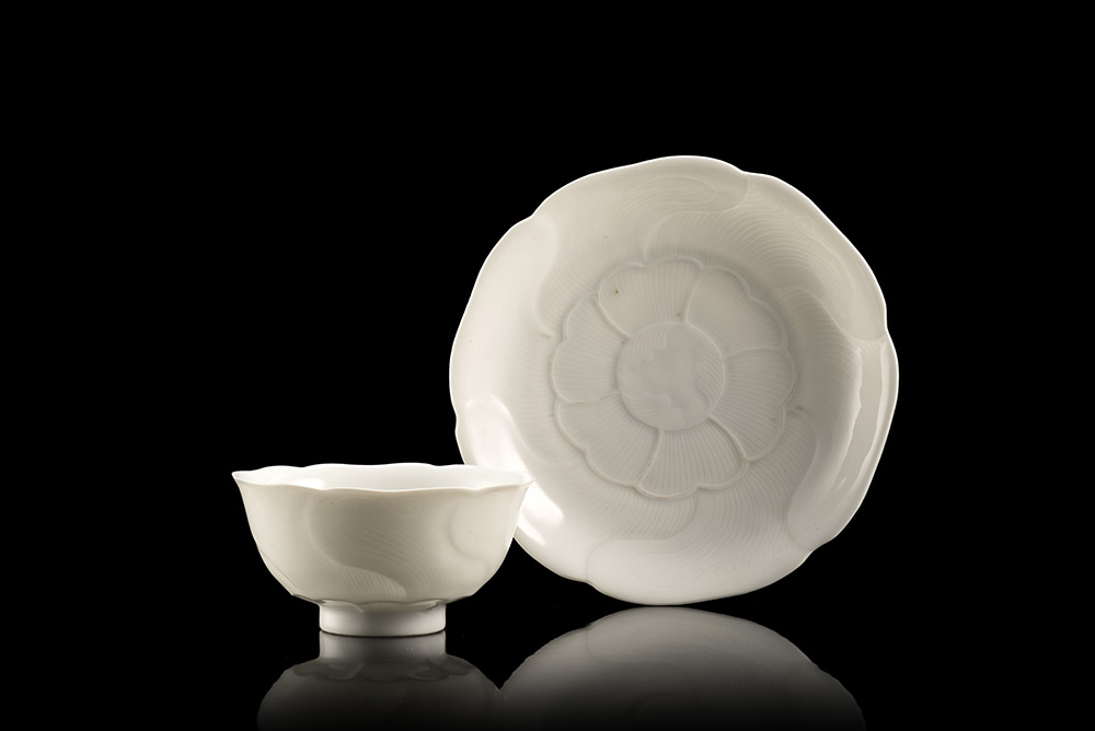 Raro set di coppetta per vino e piattino in finissima porcellana, delicatamente modellati a guisa di fiore di malva con petali sovrapposti a formare il bordo lobato, e petali di loto alla base, lo smalto di un candido colore bianco tendente leggermente ad una tonalita' avorio, ciascuno reca alla base marchio a sei caratteri Yongzheng entro doppio cerchio in blu sottocoperta Cina, marchio Yongzheng e del periodo (1723-1735) * Per questo lotto Ë disponibile l'Attestato di Libera Circolazione A rare white glazed 'mallow' wine cup and stand, each delicately modelled with a six-lobed rim resembling mallow petals, the exterior moulded and gently incised in the form of lotus petals radiating from around the foot, each with the base inscribed in underglaze blue with a six-character Yongzheng mark within a double-circle China, Yongzheng mark and of the period (1723-1735) * Export Licence is avaliable for this lot (diam. coppetta/cup 7 cm.; diam. piattino/stand 11 cm.)
