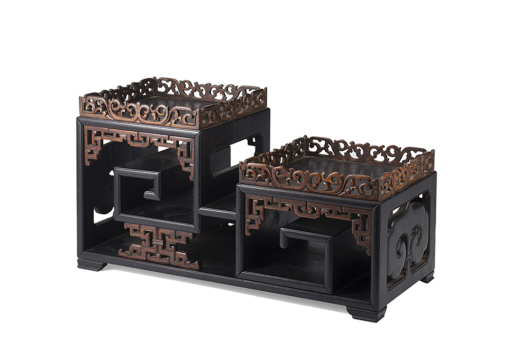 Mobiletto in legno zitan dal colore bruno intenso, composto da mensole di varia altezza e misura ornate da decori geometrici in legno huanghuali Cina, sec. XIX A zitan display stand composed by stepped shelves of various heights and sizes, embellished with huanghuali apron decorated with geometric design, the wood of a dark brown tone China, 19th century (20x35x15 cm.)