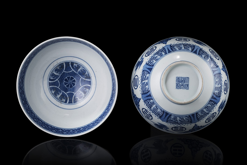 Coppia di ciotole in porcellana bianca e blu, decorate con gru in volo alternate a nuvole di forma ruyi e a otto trigrammi, al di sopra di onde in tempesta tra le rocce, líinterno con medaglione centrale con fiori e onde e bordatura a motivi geometrici, marchio a sigillo Daoguang in blu a sei caratteri alle basi (difetti) Cina, marchio Daoguang e del periodo (1820-1850) Provenienza: collezione privata Milanese. * Per questo lotto Ë disponibile l'Attestato di Libera Circolazione A pair of blue and white ëtrigram and craneí bowls, each decorated with cranes in flight alternating with ruyi-clouds, divided by the eight trigrams, above upright rocks battered by waves encircling the foot, the interior with a central medallion enclosing a floret wreathed by tempestuous waves, all within a diapered band encircling the interior rim, the base inscribed with a six-character seal mark (flaws) China, Daoguang mark and of the period (1820-1850) Provenance: a Milanese private collection. By repute, with Eskenazi. * Export Licence is avaliable for this lot (diam. 13,5 cm.)