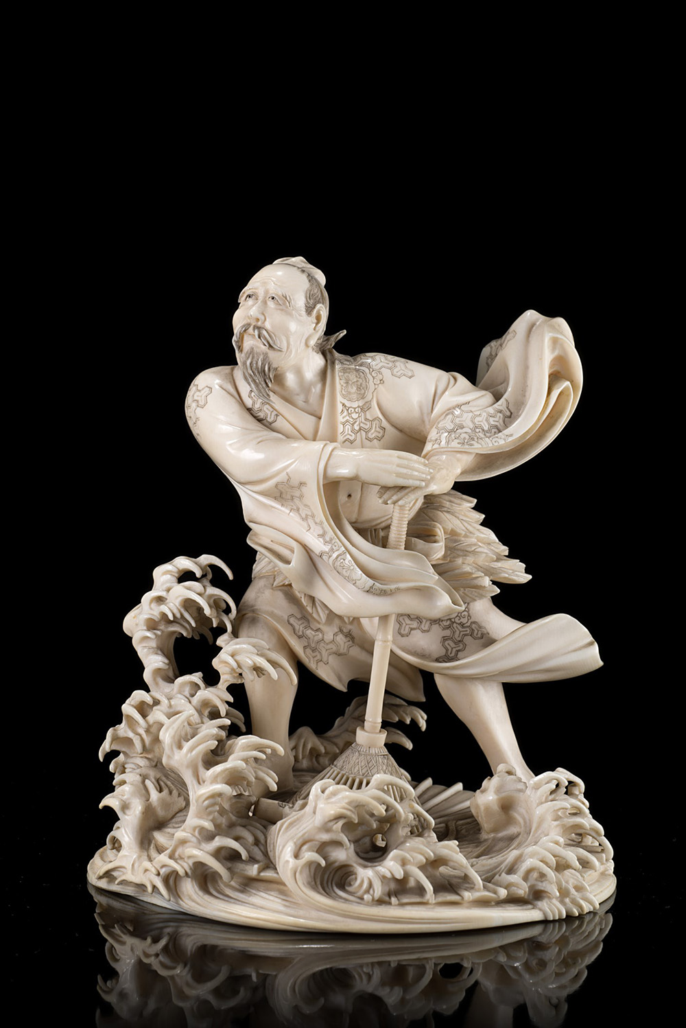 Okimono in avorio raffigurante saggio tra onde in tempesta, firma in cartiglio rosso alla base Giappone, sec. XIX Provenienza: collezione privata milanese. Acquistato da Eskenazi, 1969. An ivory okimono of a sage amongst foaming waves, singed in a red cartouch to the base Japan, 19th century Provenance: a Milanese private collection. With Eskenazi, acquired in 1969. (h. 15,5 cm.)