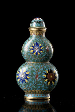 Snuff bottle in metallo cloisonnË a forma di doppia zucca decorata con fiori di loto su fondo turchese Cina, sec. XVIII Provenienza: collezione privata milanese. Acquistato da Eskenazi, 1972. A double gourd cloisonnË enamel snuff bottle decorated with lotus flowers on a turquoise ground China, 18th century Provenance: a Milanese private collection. With Eskenazi, acquired in 1972. (h. 8 cm.)