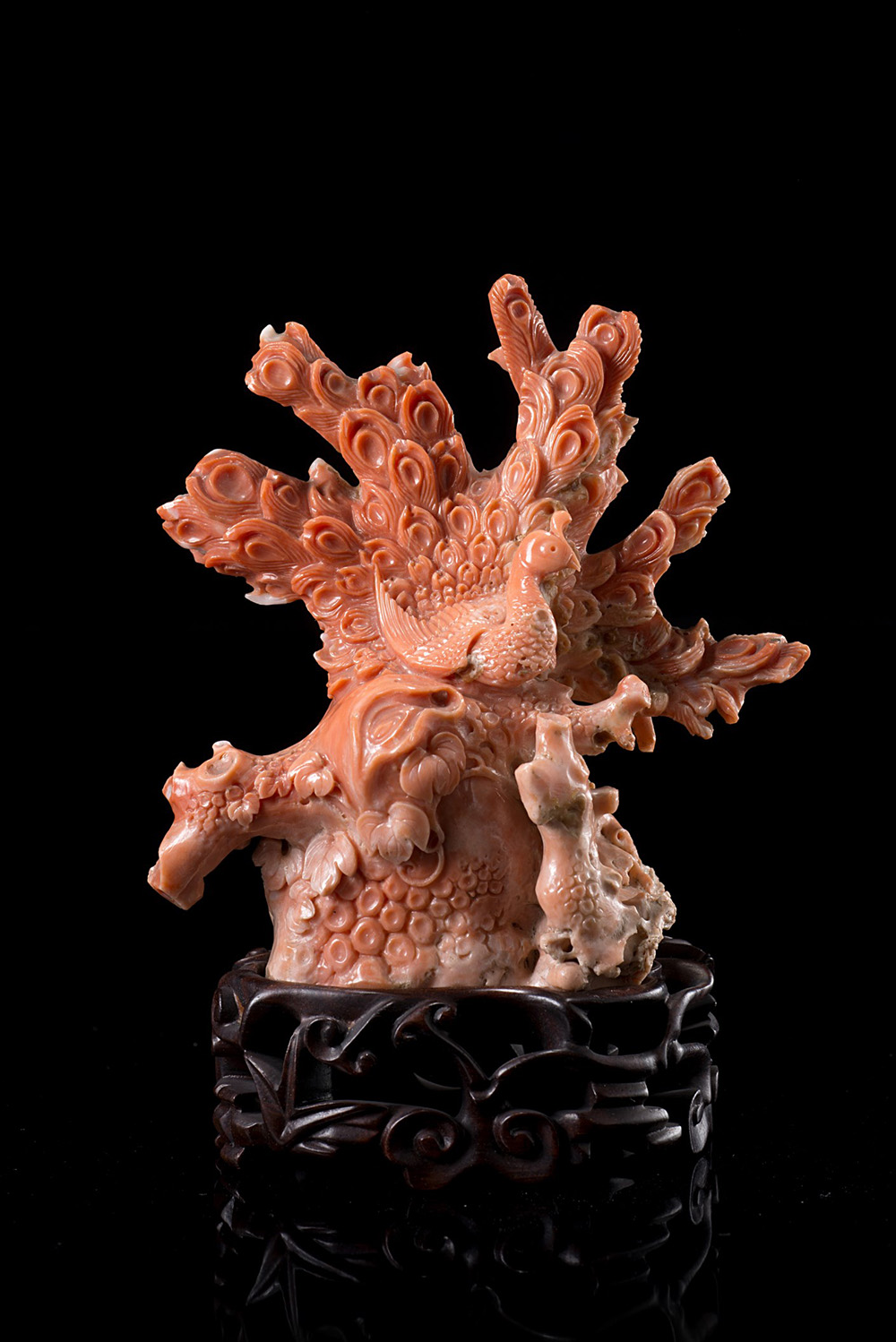Piccolo ramo in corallo rosa scolpito con pavone dalla lunga coda su ramo, base in legno (difetti) Cina, fine sec. XVIII Provenienza: collezione privata milanese. Acquistato da Eskenazi, 1969. A pink coral carving of a long-tailed peacock perched on a tree, wood base (losses) China, late 18th century Provenance: a Milanese private collection. With Eskenazi, acquired in 1969. (h. 12 cm., weight gr. 312)
