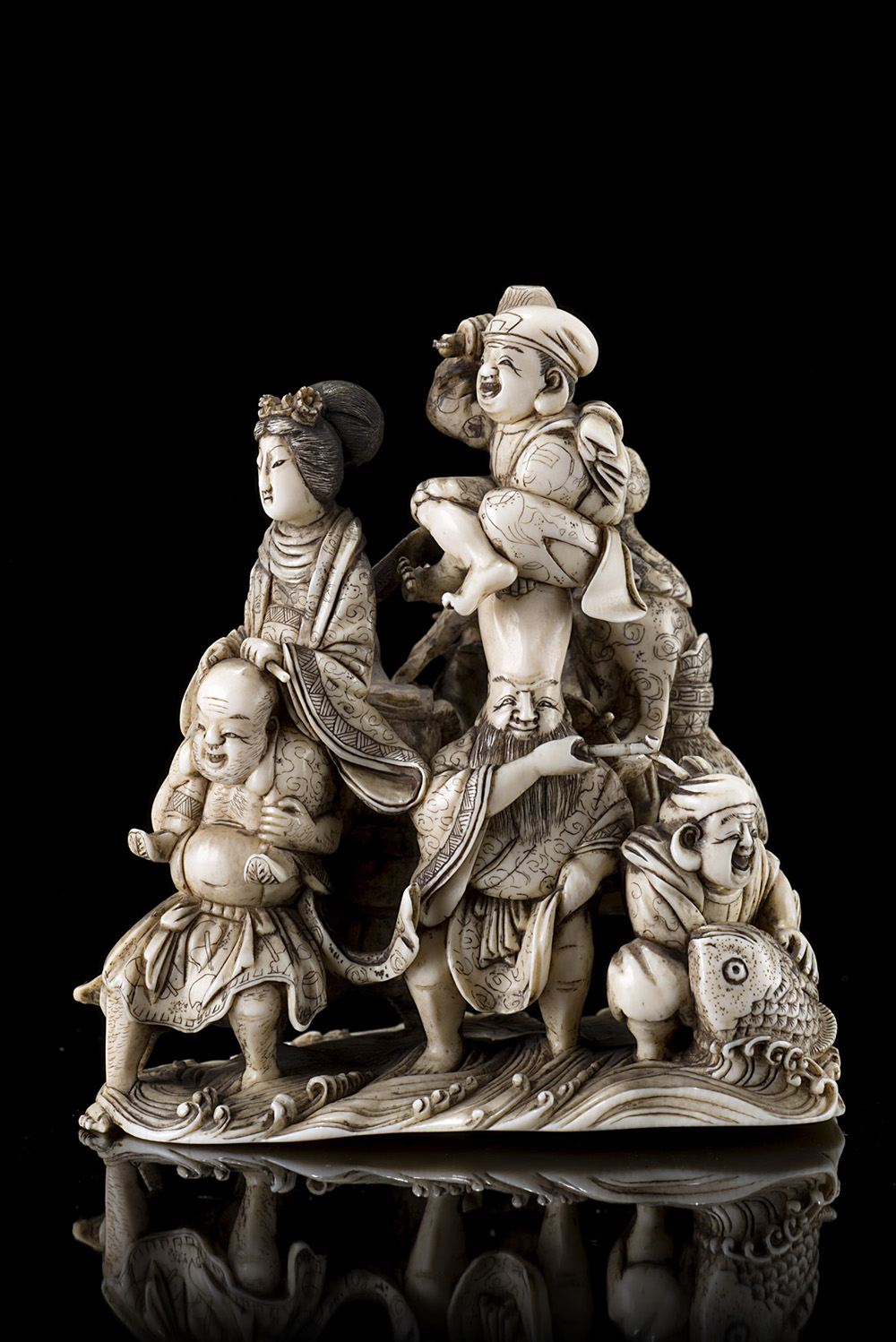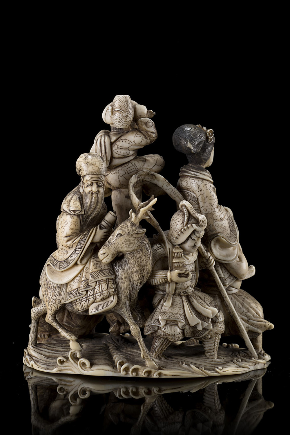 Piccolo gruppo in avorio raffigurante personaggi leggendari, firmato alla base Giappone, sec. XIX Provenienza: collezione privata milanese. A small ivory group depicting legendary figures, signature to the base Japan, 19th century Provenance: a Milanese private collection. (h. 10 cm.)