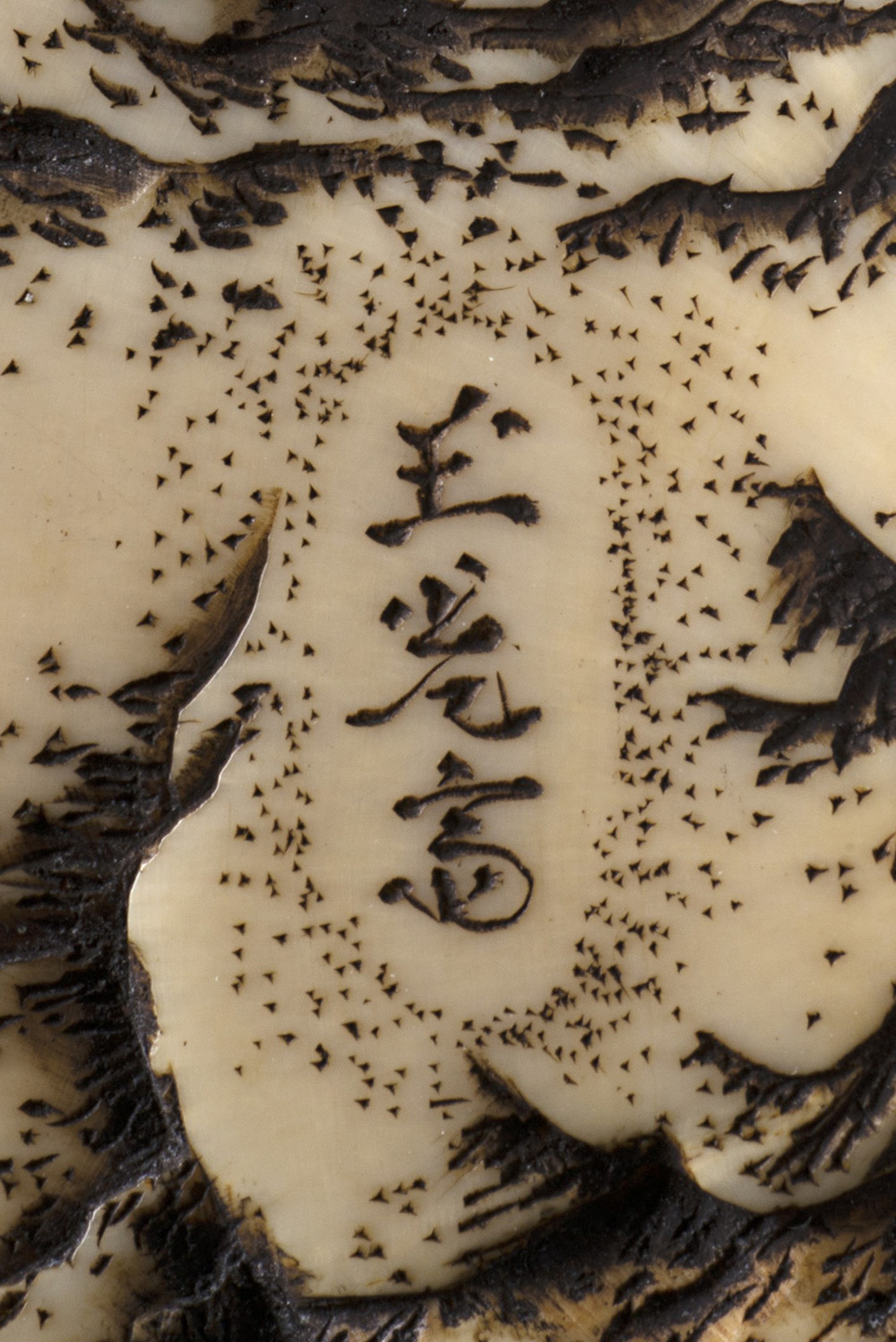 Netsuke in avorio raffigurante saggi con lungo scroll sotto alberi di palma, firmato Gyokusai alla base (difetti e restauri) Giappone, periodo Edo, sec. XIX Provenienza: collezione privata milanese. Acquistato da Eskenazi, 1973. An ivory netsuke depicting sages reading a scroll beneath pine trees, signed Gyokusai to the base (losses and restorations) Japan, Edo period, 19th century Provenance: a Milanese private collection. With Eskenazi, acquired in 1973. (h. 7 cm.)