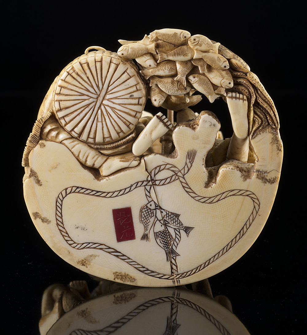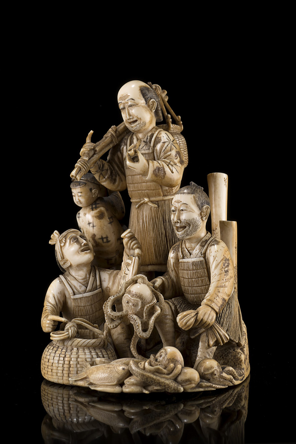 Okimono in avorio raffigurante gruppo di pescatori, firmato Gyokusen in cartiglio rosso alla base Giappone, sec. XIX Provenienza: collezione privata milanese. Acquistato da Eskenazi, 1973. An ivory okimono depicting a group of fishermen, signed Gyokusen in a red cartouche to the base Japan, 19th century Provenance: a Milanese private collection. With Eskenazi, acquired in 1973. (h. 14 cm.)
