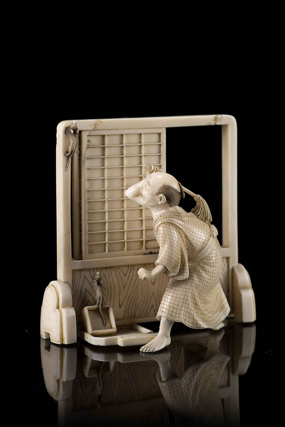Okimono in avorio raffigurante uomo che caccia topolini davanti ad una porta scorrevole Giappone, sec. XIX Provenienza: collezione privata milanese. An ivory okimono of a man chasing mice by a sliding door Japan, 19th century Provenance: a Milanese private collection. (h. 7,5 cm.)