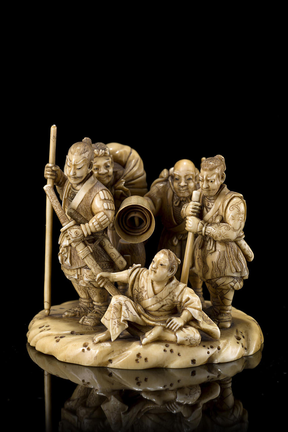 Piccolo gruppo in avorio raffigurante guerrieri con spade, firmato alla base Giappone, sec. XIX Provenienza: collezione privata milanese. Acquistato da Eskenazi, 1973. A small ivory group depicting warriors with swords, signature to the base Japan, 19th century Provenance: a Milanese private collection. With Eskenazi, acquired in 1973. (h. 7 cm.)
