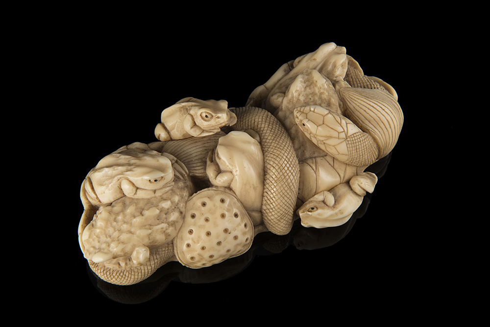 Okimono in avorio con serpente e rospi su foglia di loto, firmato Giappone,...