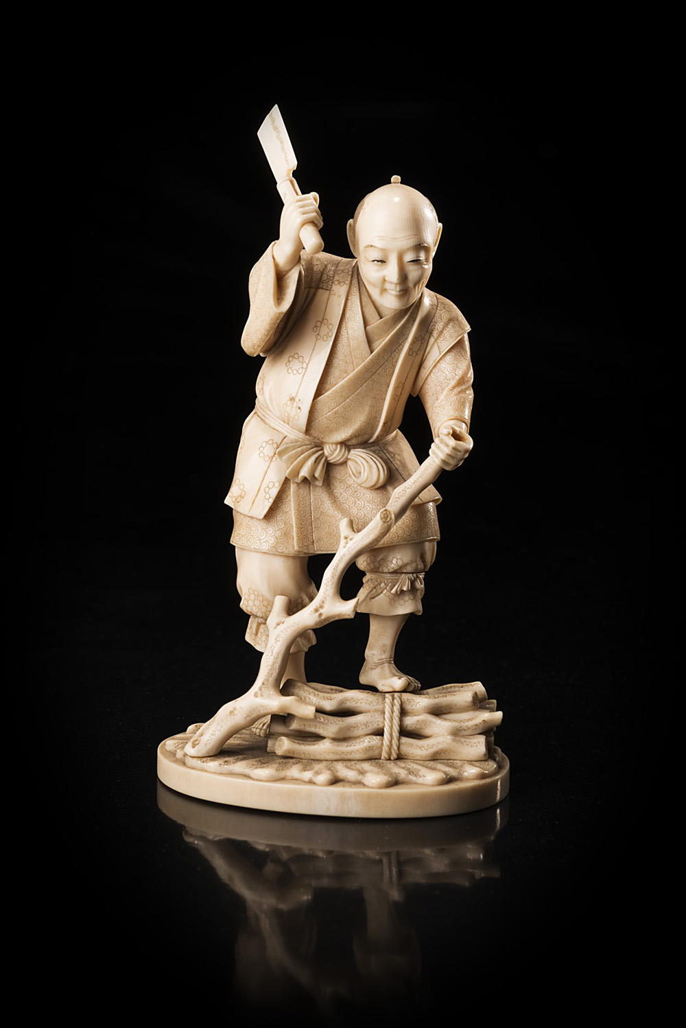Okimono in avorio raffigurante un boscaiolo, firmato in un cartiglio...