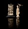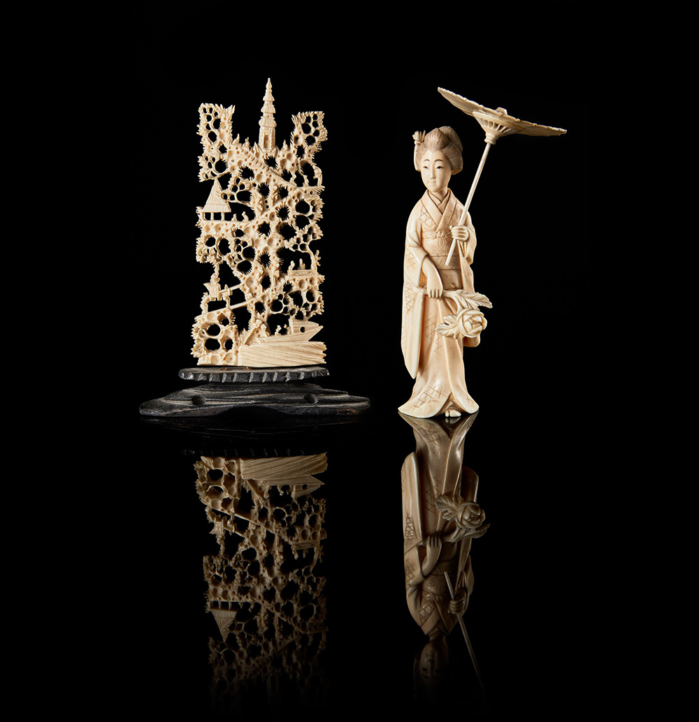 Lotto composto da una piccola scultura raffigurante una geisha con ombrellino e una composizione di avorio traforato con paesaggio di pescatori, base in legno (difetti) Cina e Giappone, sec. XX Two small ivory sculptures: a Geisha and a panel of a landscape, with wood bases (losses) China and Japan, 20th century (h. max 13,5 cm.)
