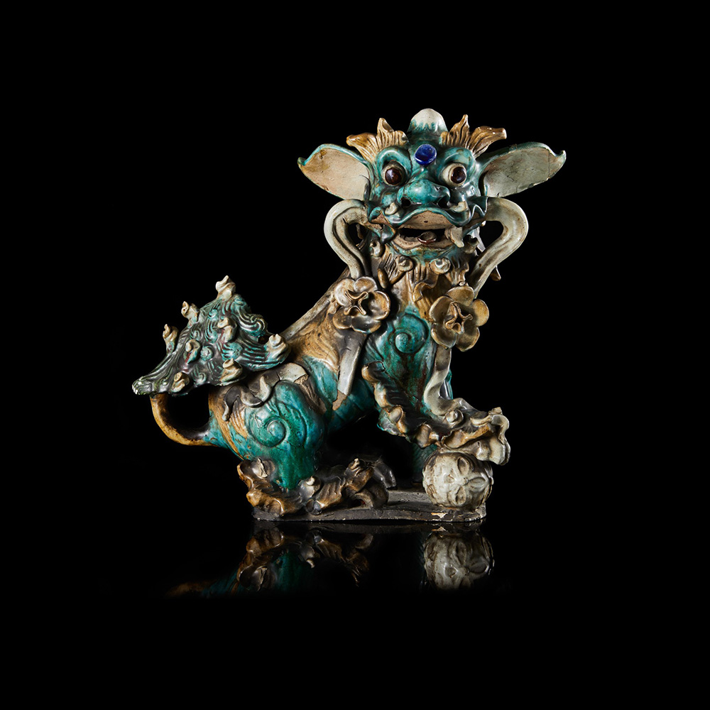 Scultura con invetriatura policroma nello stile fahua raffigurante un leone buddhista (difetti e mancanze) Cina, sec. XX A fahua style enamelled Buddhist lion (losses and flaws) China, 20th century (h. 57 cm.)