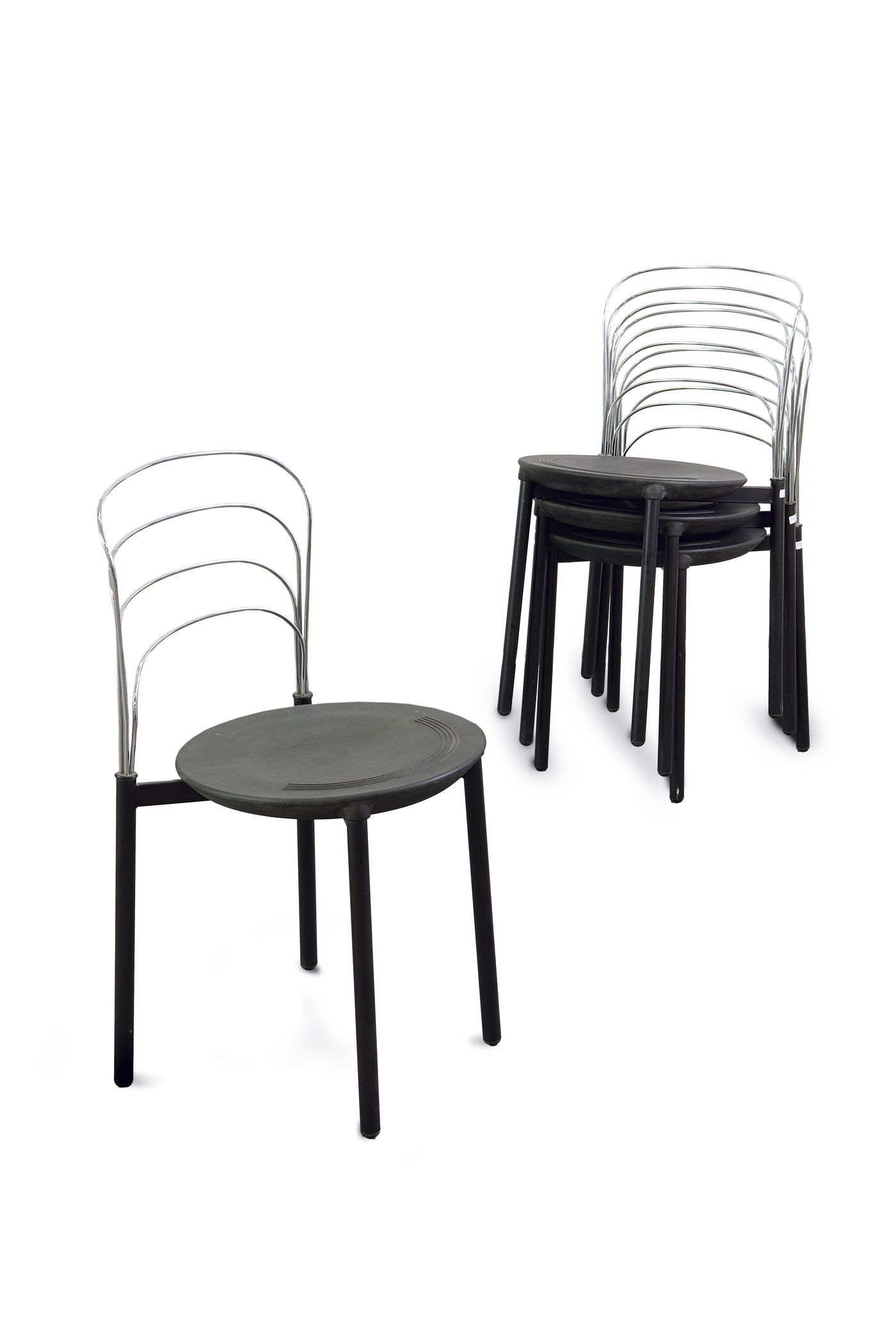 RAIMONDI GIUSEPPE - Quattro sedie sovrapponibili Delfina. Sedile in poliuretano integrale, schienale in acciaio armonico. Prod. Bontempi 1986. Premio Compasso d’oro 1987. Bibl.: Jacomussi, Chiappo Jorio, Piatti, (a cura di), Torino Design, Catalogo della mostra, Torino 6 aprile-30 giugno 1995, Allemandi, Torino, 1995, pag. 134.
