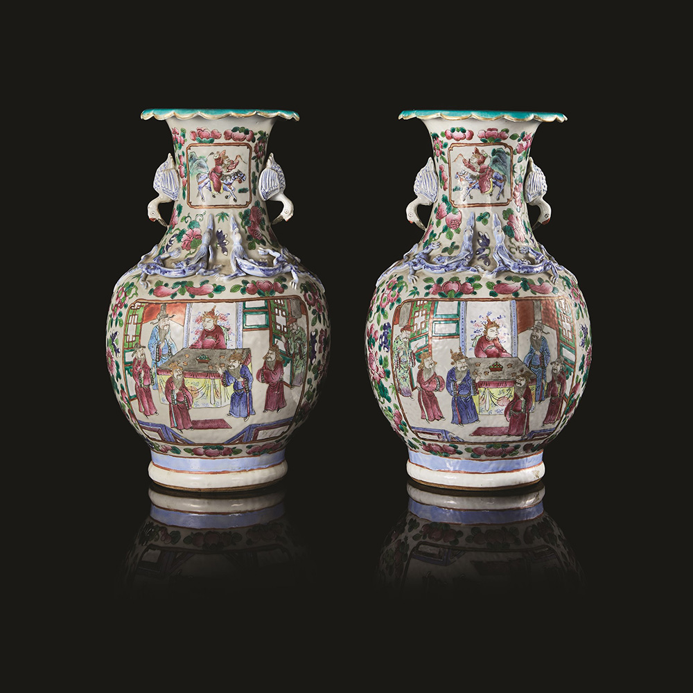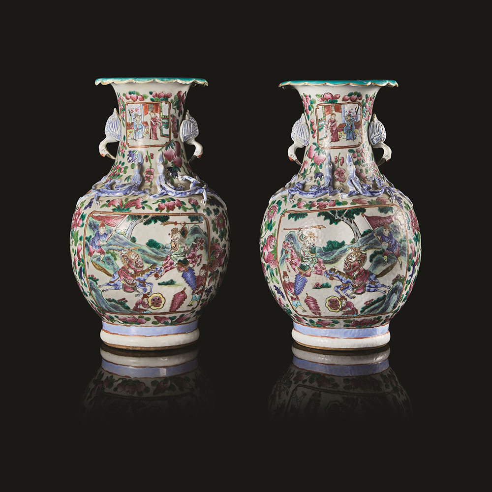 Coppia di vasi in porcellana Famiglia Rosa decorati con scene di guerra...