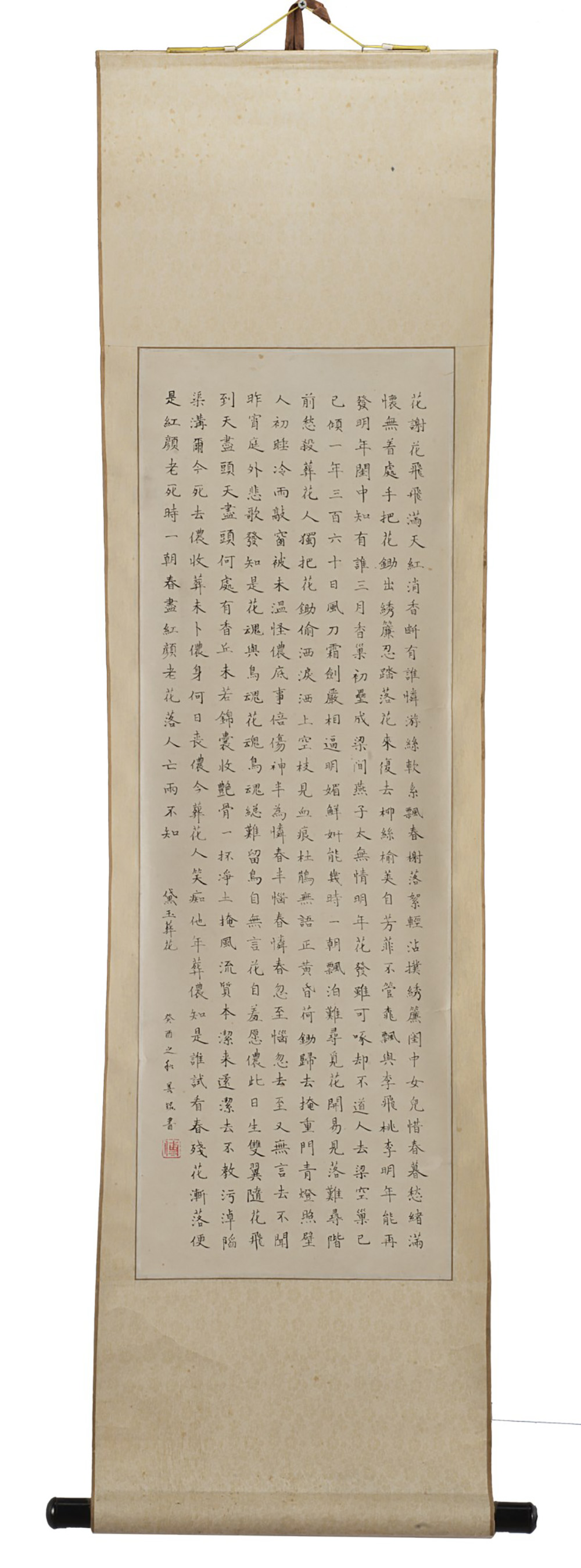 Rotolo verticale con calligrafia di un frammento del romanzo "Honglou meng", inchiostro su carta Cina, inizio sec. XX A vertical scroll with part of "Honglou meng" novel, ink and colours on paper China, first half 20th century (94x32 cm.)