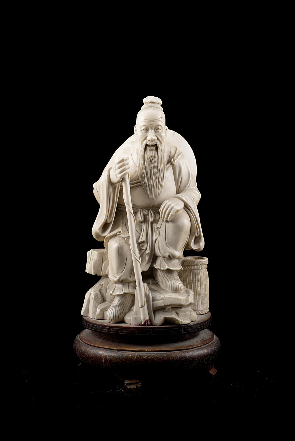 Scultura in avorio raffigurante saggio dalla lunga barba con cappello e bastone seduto su rocce, con base in legno (lievi difetti) Cina, inizio sec. XX An ivory carving of a long-bearded sage with a hat and a staff sitting on rocks, with wood base (flaws) China, early 20th century (h. 18,5 cm.)