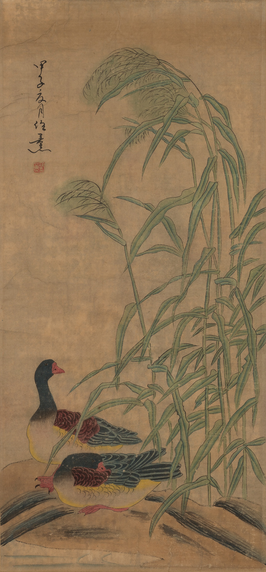 Dipinto su scroll verticale con due anatre tra le foglie, con iscrizione e...