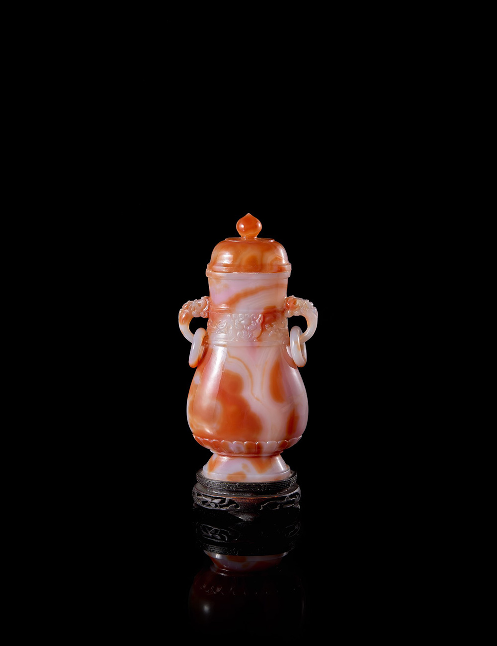 Vaso biansato con coperchio in agata corniola dalle striature color caramello, decorato con banda intagliata, con base in legno (difetti) Cina, sec. XX A carnelian agate baluster vase and cover carved with geometric pattern band, with wood base (flaws) China, 20th century (h. 25 cm.)