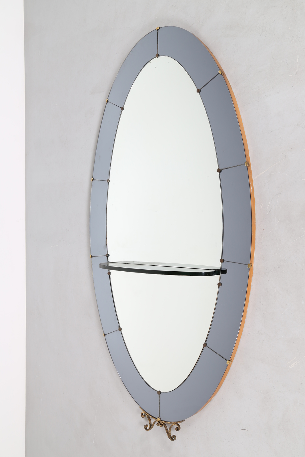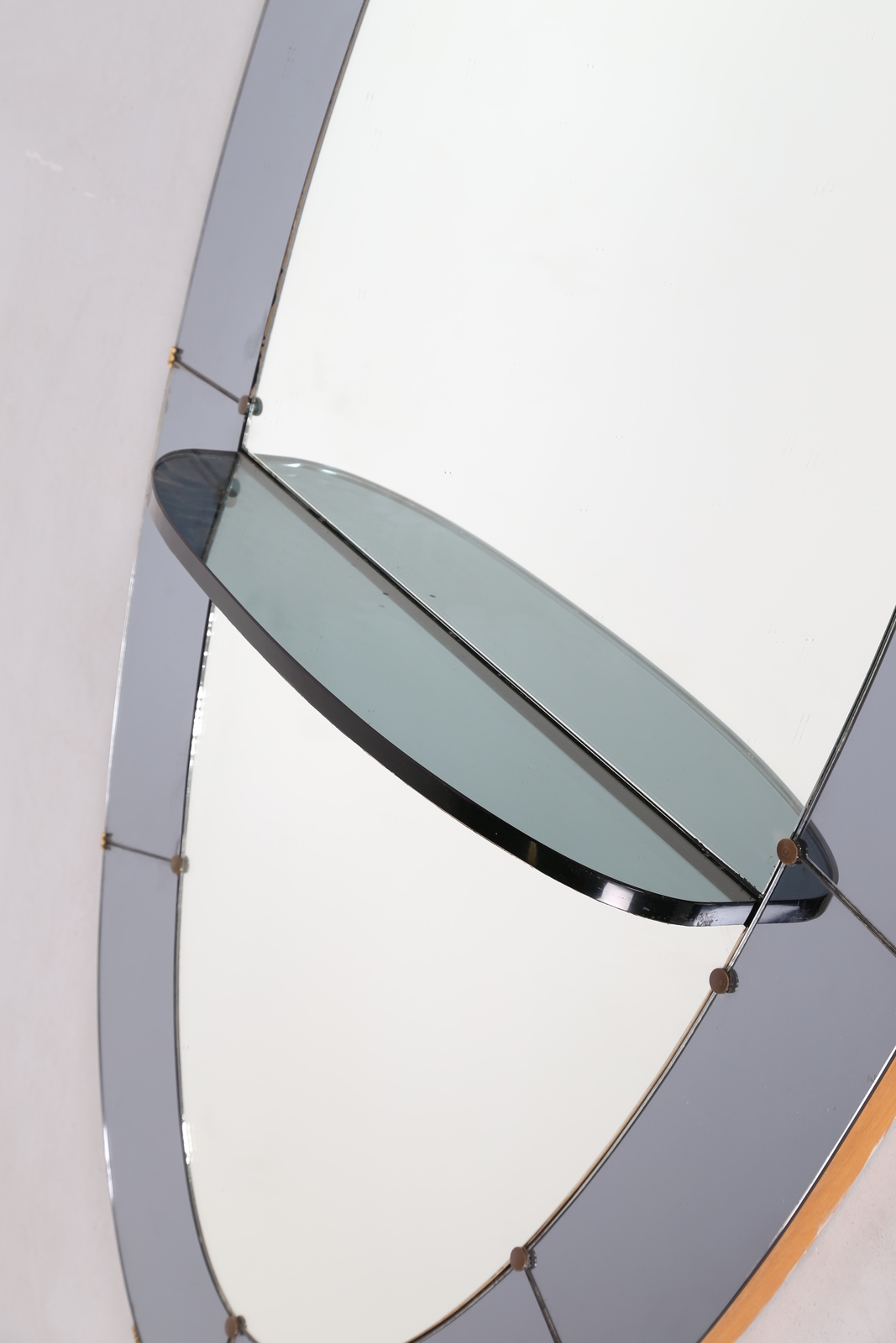 CRISTAL ART TORINO Grande specchiera da parete con mensola, cornice molata a mano, dettagli e supporto in ottone, produzione Cristal Art, anni 50 . -. Cm 120,00 x 210,00 x 23,00.